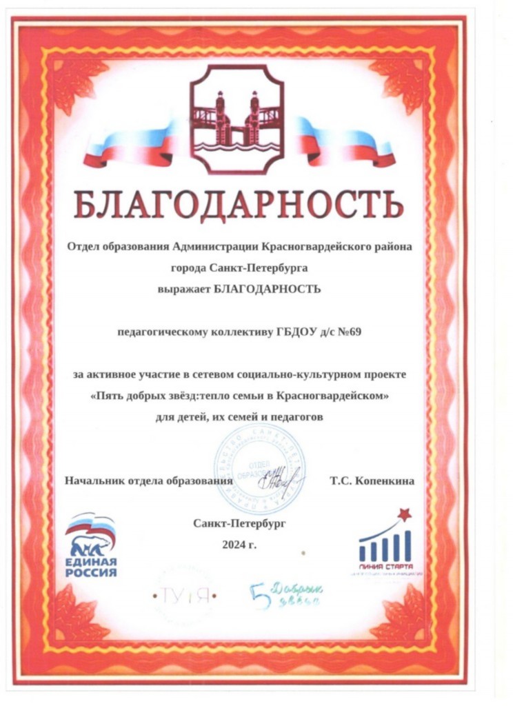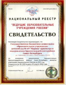 Благодарим Администрацию Красногвардейского района Санкт-Петербурга, на основании предложения которой ГБДОУ детский сад № 69 «Марина» Красногвардейского района Санкт-Петербурга является участником Национального Реестра «Ведущие образовательные учреждения России» за 2015 год, о чем свидетельствует полученное Свидетельство от 25 апреля 2016 года № 1243