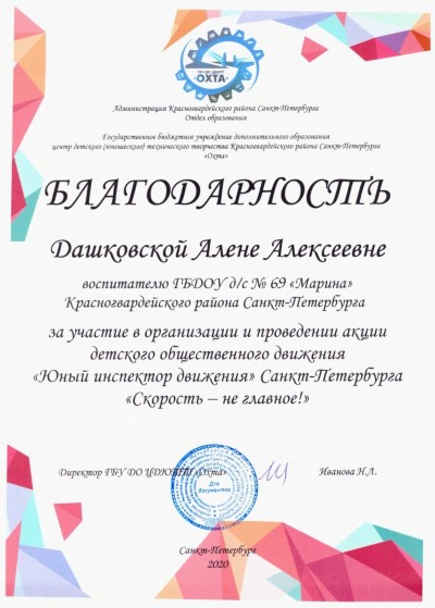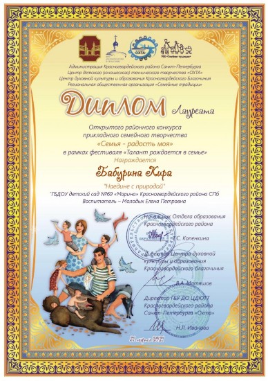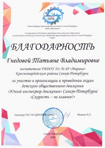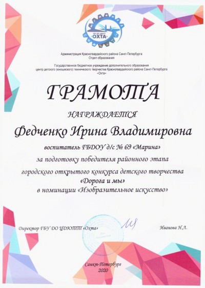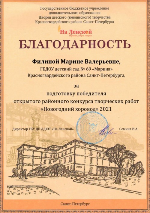 Заведующий Елена Анатольевна Винокурова получила Благодарность от Внутригородского муниципального образования Санкт-Петербурга муниципального округа «Малая Охта» за большой вклад в развитие творческого потенциала детей и помощь в сохранении культурного наследия нашей страны.