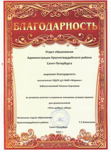 Поздравляем руководителя Винокурову Елену Анатольевну и коллектив ГБДОУ детский сад № 69 «Марина» Красногвардейского района Санкт-Петербурга с получением благодарности Отдела образования Красногвардейского района Санкт-Петербурга и Санкт-Петербургской академии посдипломного педагогического образования за отличную подготовку победителей Конкурса педагогических достижений Красногвардейского района Санкт-Петербурга 2015-2016 учебного года